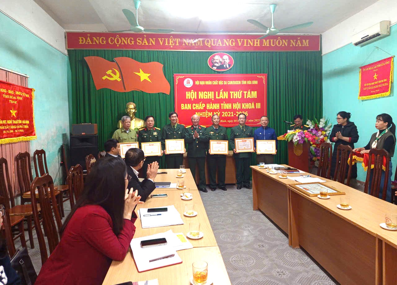 Tại Hội nghị, đồng đồng chí Nguyễn Đình Tứ, Phó Giám đốc Sở Nội vụ; đồng chí Bùi Mạnh Cường, Phó Giám đốc Sở LĐ-TB&XH phát biểu đánh giá cao những quả đạt được của Hội trong năm 2024. Chủ tịch Hội NNCĐDC/dioxin tỉnh Hòa Bình Tạ Quang Biên chỉ rõ nhiệm vụ trọng tâm của Tỉnh hội trong năm 2025 là: Tập trung chuẩn bị chu đáo nhiệm vụ đơn vị đăng cai Hội nghị Trao đổi kinh nghiệm công tác hội của 26 tỉnh, thành phố phía Bắc; kỷ niệm 64 năm Thảm hoạ da cam ở Việt Nam và hưởng ứng Tháng hành động vì NNCĐDC năm 2025; Tổng kết 10 năm thực hiện Chỉ thị số 43-CT/TW ngày 14/5/2025 của Ban Bí thư; tiếp tục tổ chức đưa, đón NNCĐDC đi xông hơi thải độc và duy trì nền nếp công tác tự kiểm tra, kiểm tra giám sát việc thực hiện Điều lệ Hội, các quy chế làm việc tại các cấp Hội; tiếp tục ủng hộ cuộc đấu tranh đòi công lý cho NNCĐDC Việt Nam.