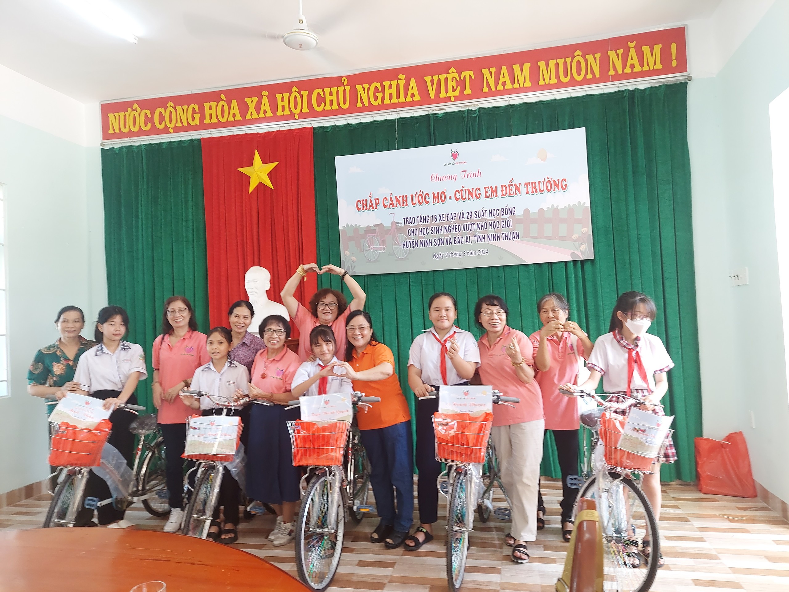 Hai huyện Ninh Sơn và Bác Ái có 37 học sinh hoàn cảnh đặc biệt khó khăn được tặng xe đạp và học bổng, với tổng trị giá 56 triệu đồng; trong đó có 29 suất học bổng (trị giá 1 triệu đồng/suất) và 18 chiếc xe đạp (trị giá 1,5 triệu đồng/chiếc).