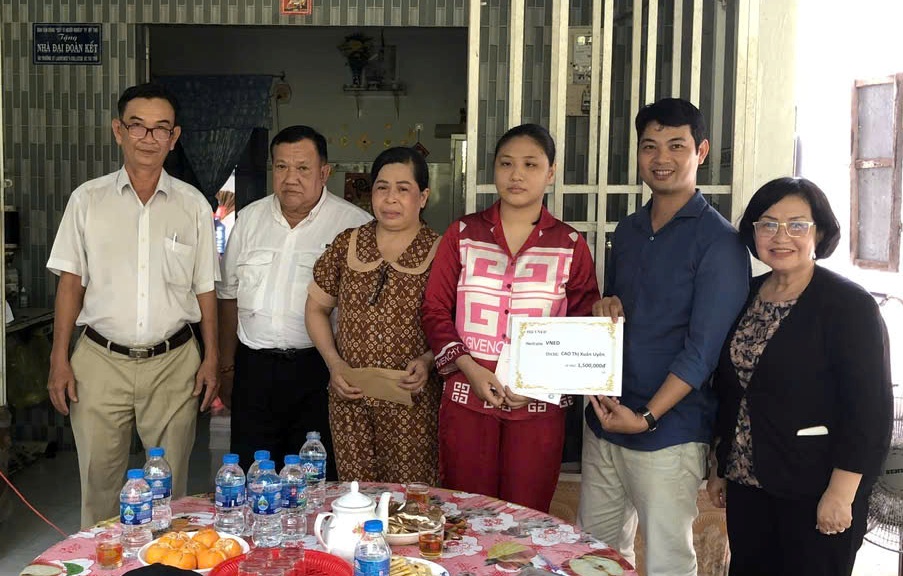 Bà Trần Thị Quý Mão, Chủ tịch Tỉnh hội (người đầu tiên bên phải) và nhà tài trợ đến thăm hỏi, tặng quà cho nạn nhân xã Đạo Thành, thành phố Mỹ Tho