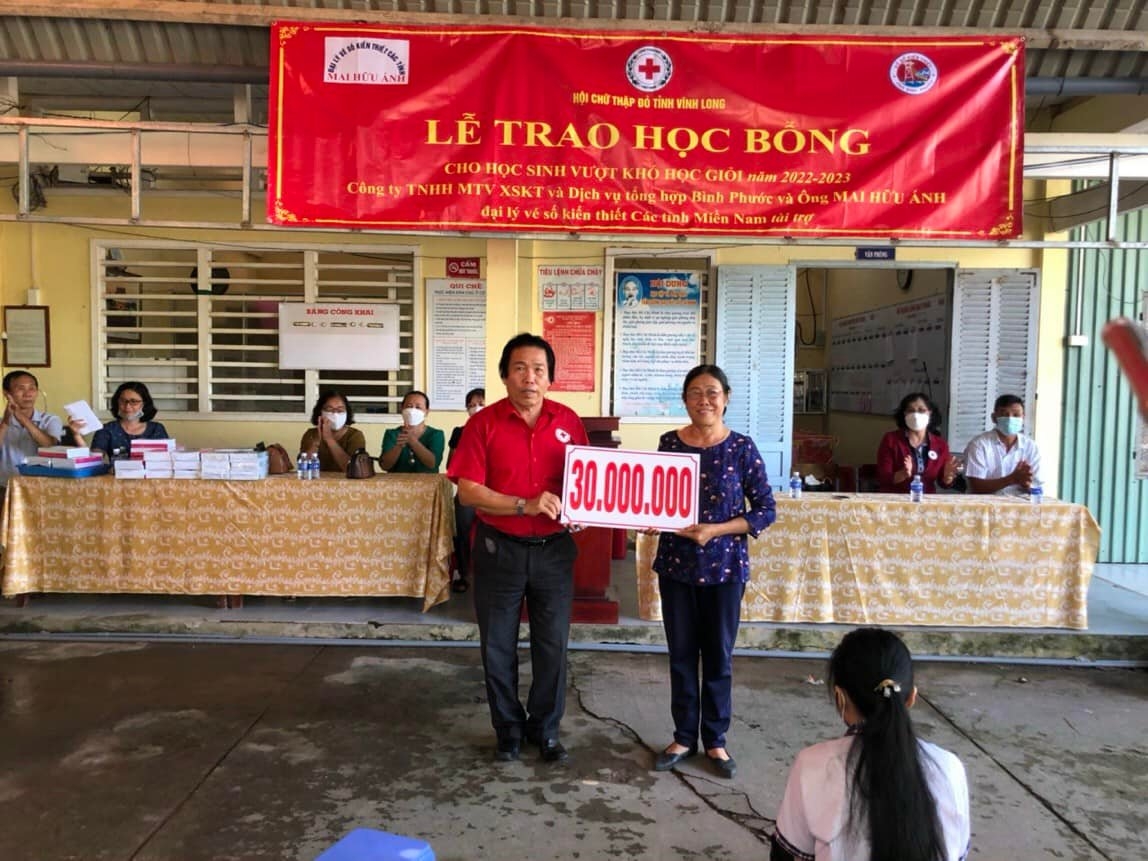 Ngày 06/7/2022, Hội Nạn nhân chất độc da cam/dioxin-Người khuyết tật và Bảo trợ xã hội tỉnh Vĩnh Long được sự vận động tài trợ của ông Mai Hữu Ánh - Đại lý vé số kiến thiết miền Nam và Công ty TNHH MTV Xổ số kiến thiết và dịch vụ tổng hợp Bình Phước hỗ trợ 30 suất học bổng, mổi suất 1 triệu đồng; Tỉnh hội tặng 10 quyển tập/suất cho học sinh là con nạn nhân chất độc da cam, con người khuyết tật và hoc sinh khuyết tật, mồ côi, góp phần tiếp sức cho các em có điều kiện tiếp tục đến trường. Tổng giá trị là 31 triệu 500 ngàn đồng. Món quà tuy nhỏ nhưng mang ý nghĩa nhân văn sâu sắc, giúp đỡ và động viên các em cùng gia đình cố gắng vươn lên./.