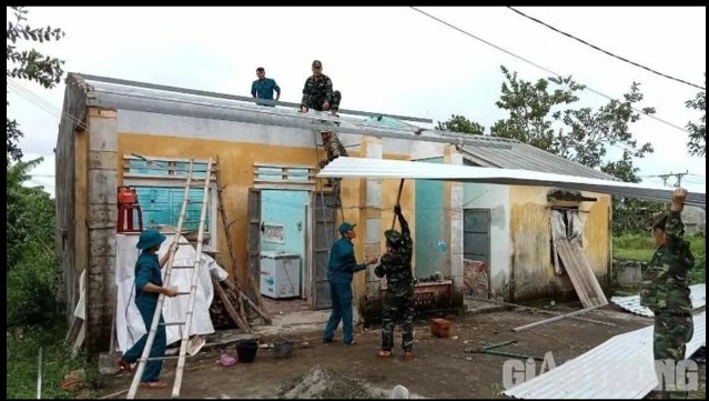 | Hình ảnh những cán bộ chiến sỹ công an, quân đội, dân quân tự vệ và người dân cùng chung tay dựng lại nhà cho người dân bị bão số 4 làm hư hỏng tạo nên nét đẹp của người Việt Nam trong hoạn nạn. |