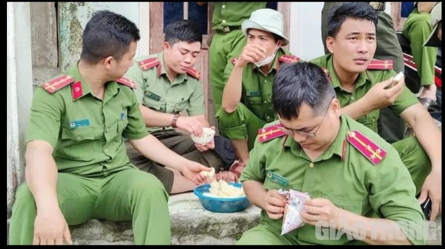 | Phút nghỉ ngơi của các cán bộ, chiến sỹ Công an huyện Sơn Hà sau khi giúp dân dựng lại nhà là dùng củ mì mà người dân nấu. |