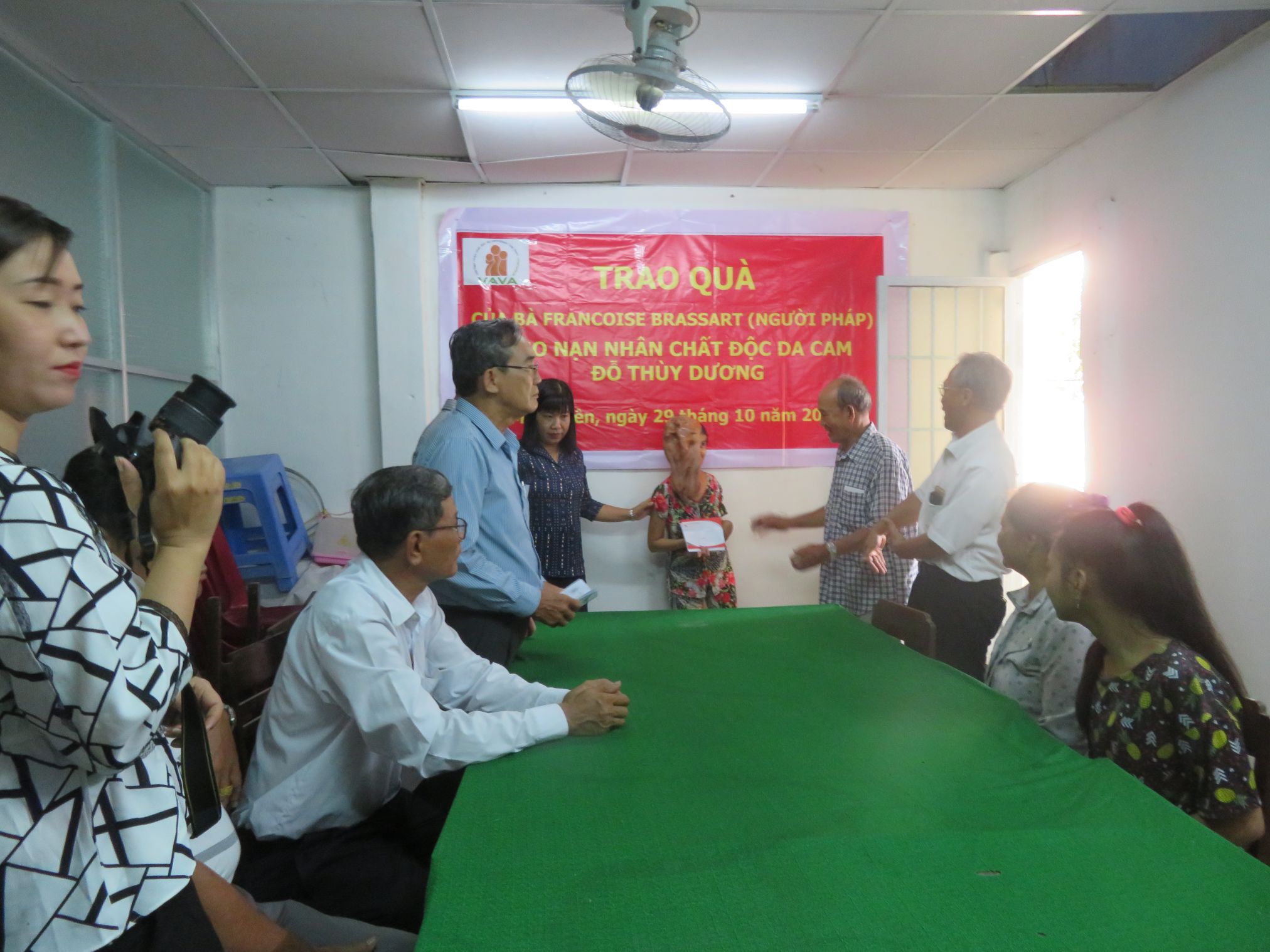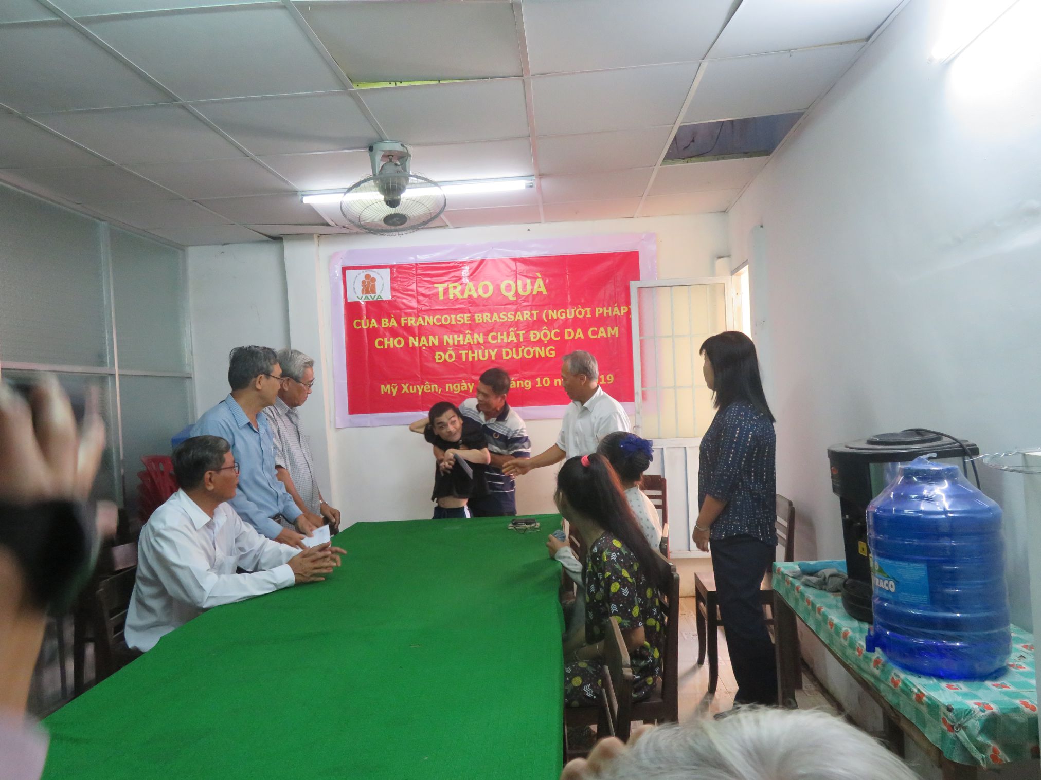 Tại Hội trường UBMTTQ huyện, Bà Nguyễn Thị Hồng Cẩm – Bí thư Huyện ủy hỗ trợ 1.000.000đ, Tỉnh Hội hỗ trợ 2.574.000 đ (từ nguồn Quỹ nạn nhân chất độc da cam Việt Nam do bà Francoise Brassart – người Pháp tài trợ) cho nạn nhân Đỗ Thùy Dương, ấp Châu Thành, thị trấn Mỹ Xuyên. Nhân dịp này Tỉnh Hội cũng hỗ trợ 03 NNCĐDC, người khuyết tật trên địa bàn huyện trị giá 300.000đ (ba trăm ngàn đồng)/phần.