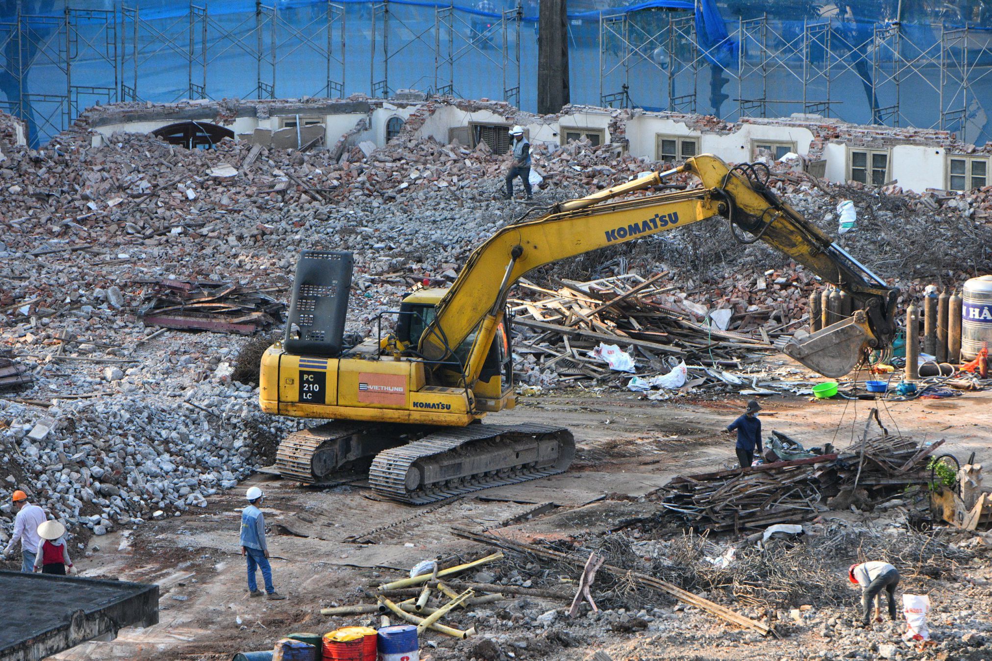 Đầu tháng 4, chủ đầu tư chuẩn bị khởi công xây dựng công trình đa chức năng cao 11 tầng, sau khi phá bỏ công trình cũ từ thời Pháp thuộc ở số 61 Trần Phú, quận Ba Đình. Ảnh: Thạch Thảo.