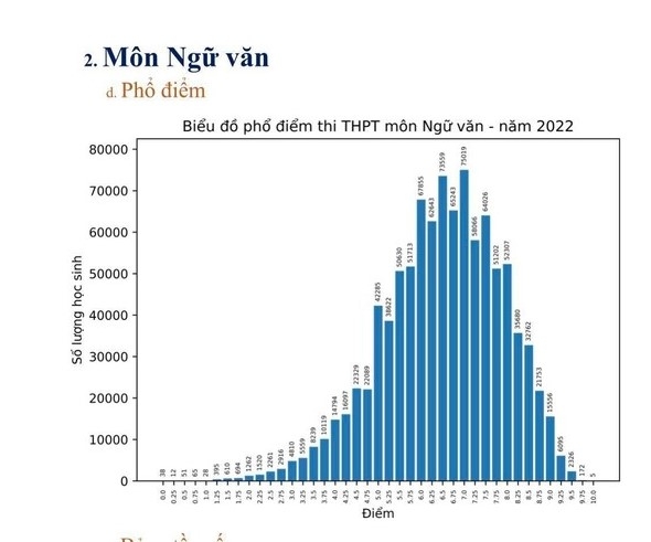 Kỳ thi Tốt nghiệp THPT 2022, môn Ngữ văn của cả nước năm 2022 có 981,407 thí sinh tham gia, trong đó điểm trung bình là 6.51 điểm, điểm trung vị là 6.5 điểm; điểm số có nhiều thí sinh đạt nhất là 7.0 điểm.