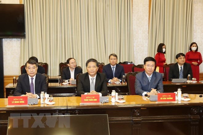 Thay mặt hai đồng chí nhận nhiệm vụ, đồng chí Võ Văn Thưởng, Ủy viên Bộ Chính trị, Thường trực Ban Bí thư phát biểu, trân trọng cảm ơn Tổng Bí thư, Chủ tịch nước Nguyễn Phú Trọng, cảm ơn Bộ Chính trị đã tin tưởng phân công nhiệm vụ rất quan trọng của Đảng vào thời điểm khởi đầu một giai đoạn phát triển mới của đất nước. Đây thực sự là một vinh dự lớn lao, đồng thời là một trách nhiệm rất nặng nề trong bối cảnh toàn Đảng, toàn dân đang kỳ vọng vào những bước phát triển vững chắc của Đảng và đất nước sau Đại hội XIII của Đảng thành công rất tốt đẹp.
