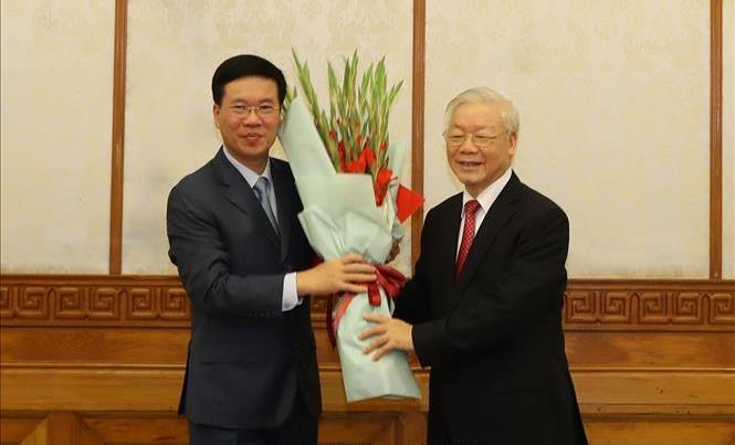 Tổng Bí thư, Chủ tịch nước Nguyễn Phú Trọng chúc mừng đồng chí Võ Văn Thưởng.