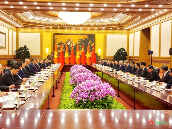 Hai nhà lãnh đạo đã đi sâu trao đổi về các định hướng lớn nhằm tăng cường tin cậy, củng cố hữu nghị, nâng cao hiệu quả hợp tác thực chất trên các lĩnh vực, duy trì hòa bình, ổn định trên biển, đưa quan hệ Việt Nam - Trung Quốc tiếp tục phát triển lành mạnh, ổn định, bền vững theo đúng phương châm “16 chữ”, tinh thần “4 tốt”.