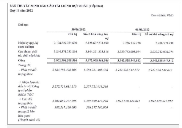 Đáng chú ý, FLC cũng có một khoản phải trả dài hạn trị giá 2.277 tỷ đồng, là khoản nhận hợp tác đầu tư với CTCP BEDA T&C. Hồi đầu năm, FLC không có khoản phải trả này.