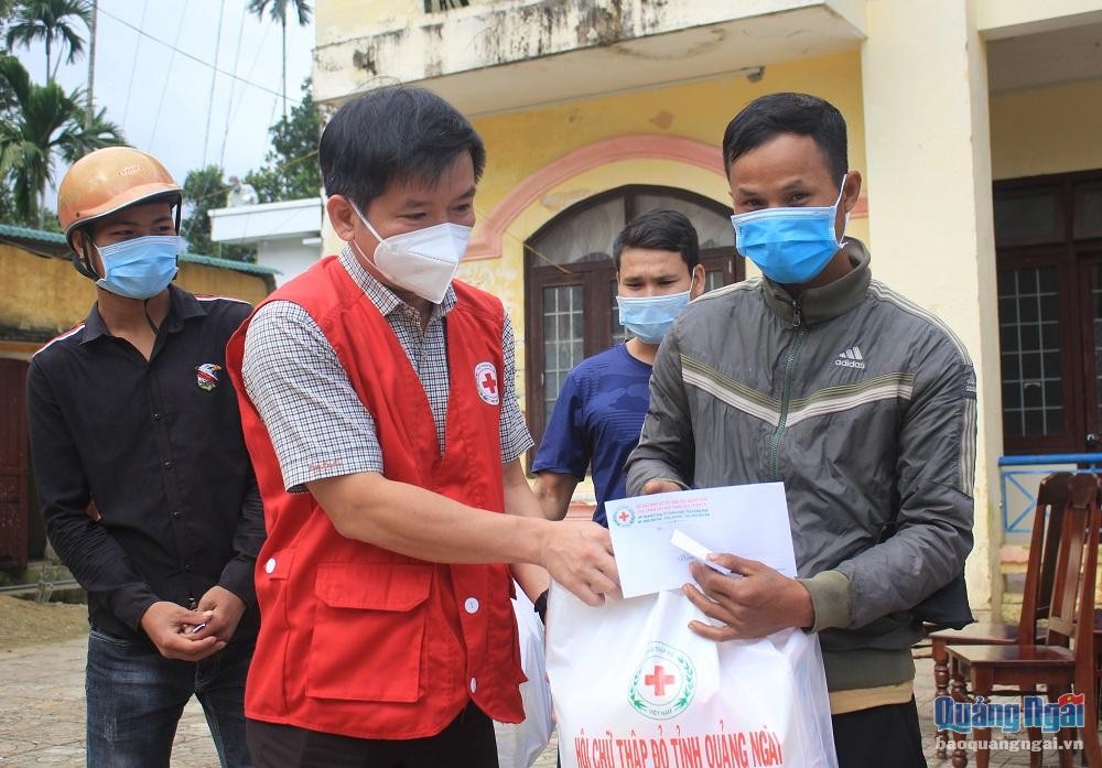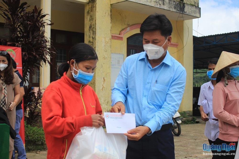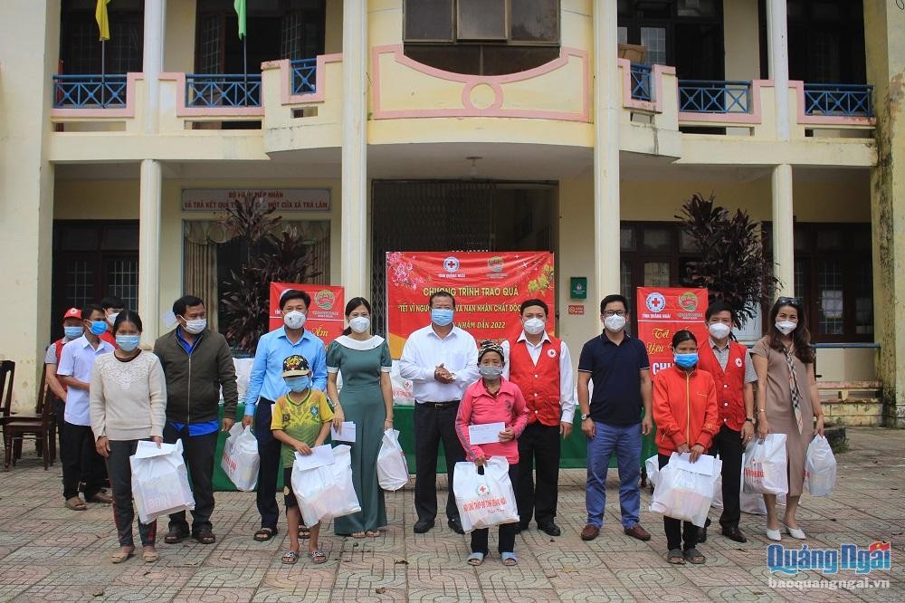 Phó Chủ tịch, Phụ trách Hội Chữ thập đỏ tỉnh tặng quà cho người nghèo ở xã Trà Lâm (Trà Bồng).