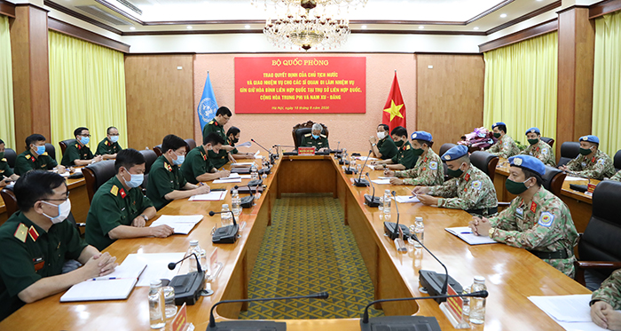Chiều 18/8, tại Hà Nội, Bộ Quốc phòng tổ chức trao quyết định của Chủ tịch nước và giao nhiệm vụ cho các sĩ quan đi làm nhiệm vụ gìn giữ hòa bình (GGHB) Liên Hợp Quốc tại Trụ sở Liên Hợp Quốc, Cộng hòa Trung Phi và Nam Sudan.