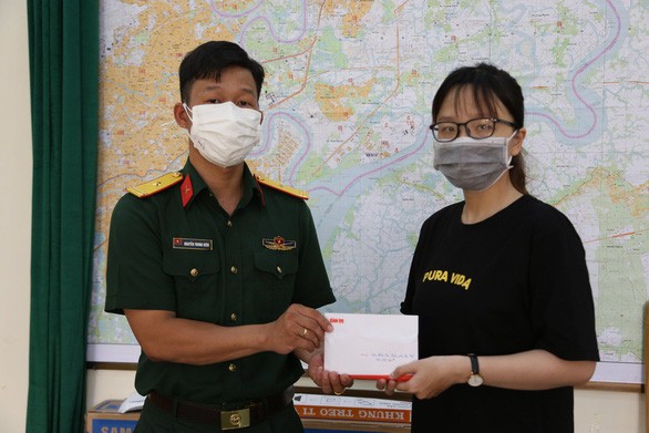 Thiếu tá Nguyễn Trung Kiên - Ban chỉ huy quân sự TP Thủ Đức - tiếp nhận tấm lòng nhà hảo tâm gửi tới bé Châu.