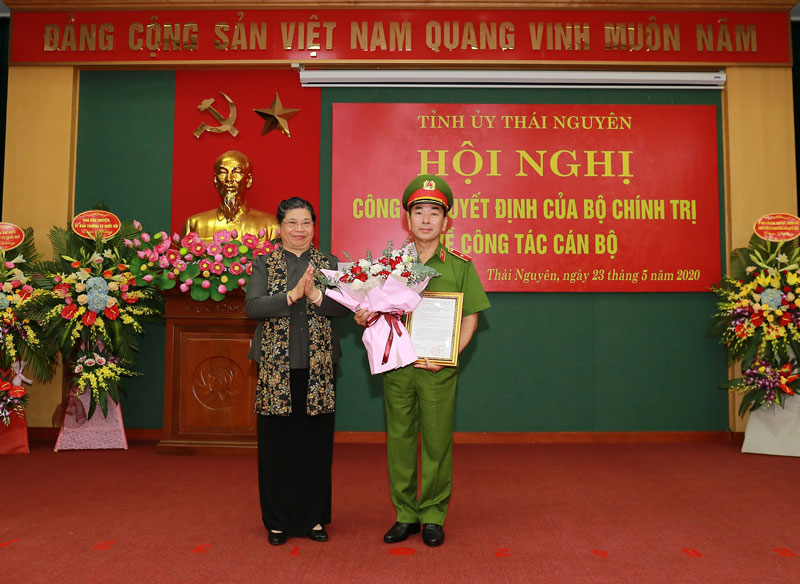 Đồng chí Tòng Thị Phóng, Ủy viên Bộ Chính trị, Phó Bí thư Đảng đoàn, Phó Chủ tịch Thường trực Quốc hội tặng hoa chúc mừng đồng chí Trần Quốc Tỏ, Ủy viên Trung ương Đảng, Thứ trưởng Bộ Công an. - Ảnh: Báo Thái Nguyên