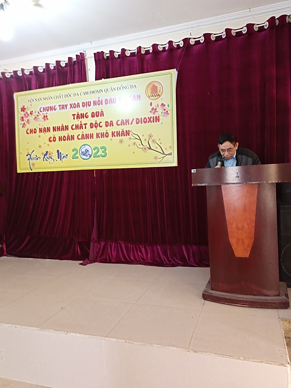 | Đại tá Trần Đình Đích, Tổng Biên tập Tạp chí Da cam Việt Nam phát biểu tại buổi trao quà cho NNCĐDC quận Đống Đa, thành phố Hà Nội, ngày 13/01/2023 |