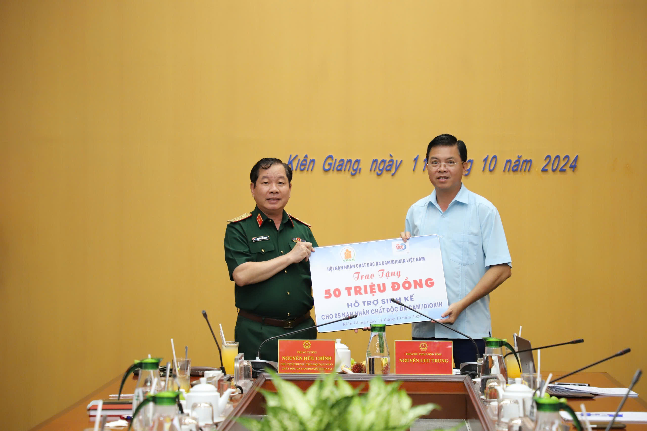 Theo báo cáo, tỉnh Kiên Giang hiện có 2.243 người hoạt động kháng chiến và con đẻ của họ bị nhiễm chất độc hoá học; trong đó, có 1.180 người hưởng trợ cấp ưu đãi hằng tháng. Có trên 26.000 người khuyết tật đang hưởng trợ cấp xã hội (trong số này, có người dân sống trong vùng quân đội Mỹ sử dụng chất độc hoá học, để lại di chứng dị tật). Công tác chăm sóc, giúp đỡ NNCĐDC được quan tâm, quá trình thực hiện có sự phối hợp chặt chẽ, đồng bộ giữa các sở, ban, ngành chức năng địa ở địa phương. Công tác vận động nguồn lực chăm lo cho NNCĐDC đạt kết quả cao. Từ năm 2015-2024, Hội NNCĐDC/dioxin tỉnh đã vận động tiền, quà và vật chất trị giá trên 18 tỷ đồng hỗ trợ cho NNCĐDC, người khuyết tật, người nghèo trên địa bàn tỉnh vượt qua khó khăn trong cuộc sống.