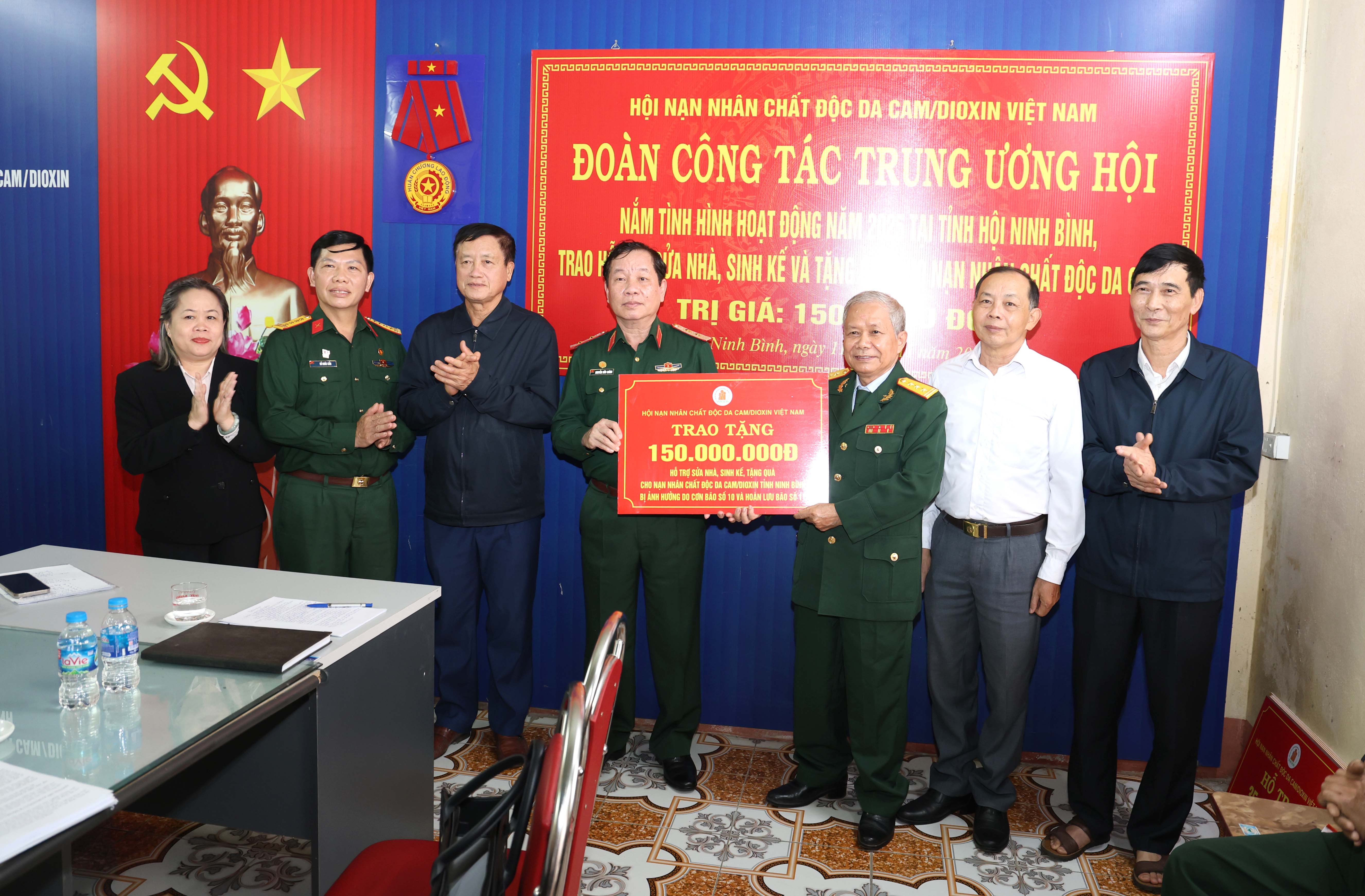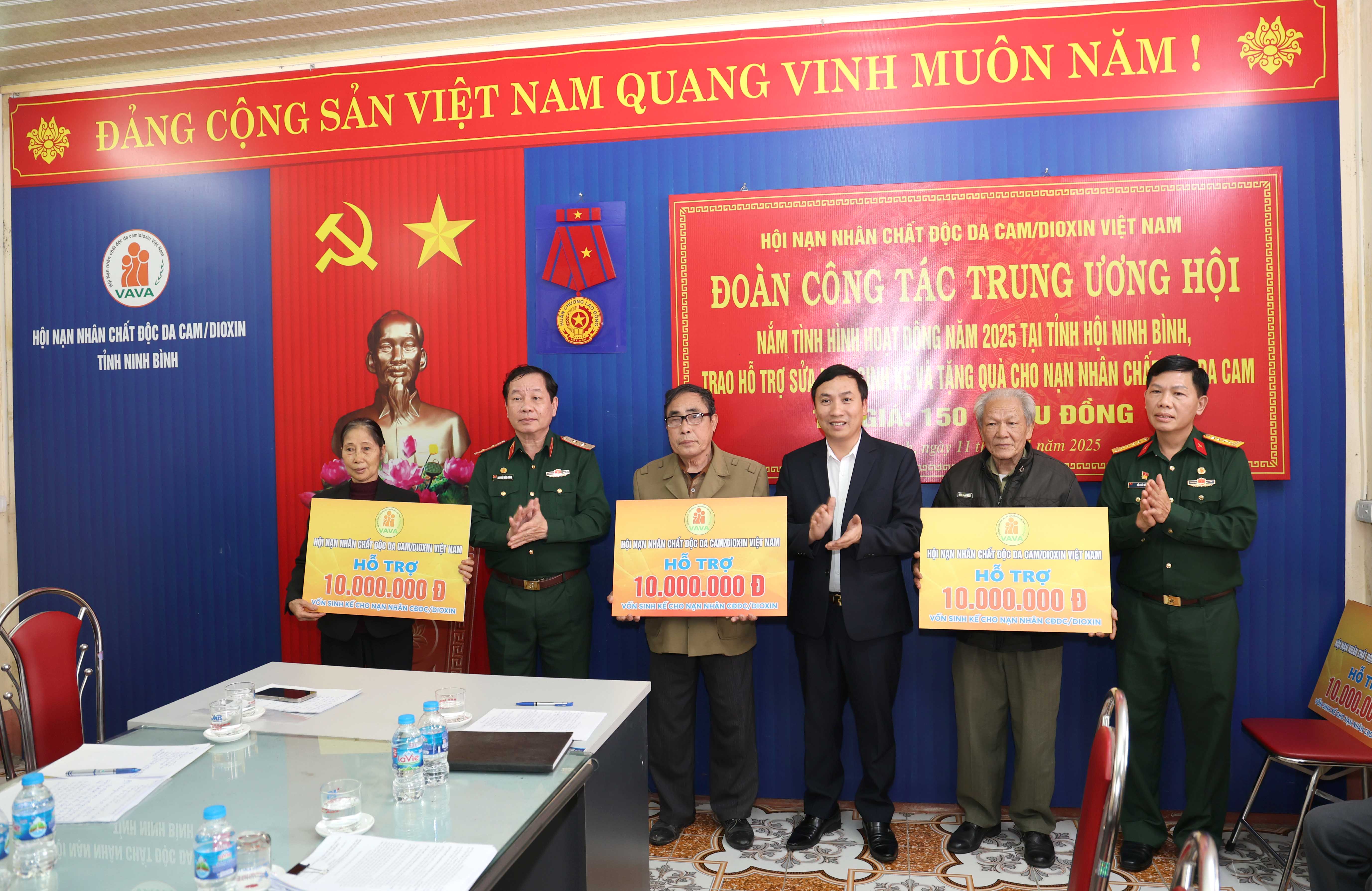Tại tỉnh Ninh Bình, tiếp đoàn có đại diện Ban Tuyên giáo và Dân vận Tỉnh ủy, MTTQ tỉnh, Sở Nội vụ cùng Thường trực Tỉnh hội. Tỉnh Ninh Bình mới được sáp nhập từ 3 tỉnh: Hà Nam, Nam Định, Ninh Bình; được sự quan tâm của Tỉnh ủy, UBND, Ủy ban MTTQ tỉnh, từ ngày 27/6/2025, Ủy ban MTTQ tỉnh đã tổ chức Hội nghị quán triệt về phương hướng hợp nhất các hội quần chúng do Đảng, Nhà nước giao nhiệm vụ dưới sự chủ trì của đồng chí Phó Bí thư Thường trực Tỉnh ủy; ngày 2/7, Thường trực Hội của 3 tỉnh đã họp triển khai thực hiện việc xây dựng đề án hợp nhất; sau một thời gian thực hiện khẩn trương, Hội đã hoàn chỉnh hồ sơ hợp nhất gửi về Ủy ban MTTQ và Sở Nội vụ tỉnh; đến ngày 21/8/2025, UBND tỉnh đã có Quyết định 461/QĐ-UBND về việc cho phép hợp nhất Hội NNCĐDC/dioxin 3 tỉnh: Hà Nam, Nam Định và Ninh Bình thành Hội NNCĐDC/dioxin tỉnh Ninh Bình. Đồng thời, UBND tỉnh đồng ý Đề án nhân sự của Hội với Ban Chấp hành lâm thời gồm 17 người, Thường trực Tỉnh hội 7 người (bao gồm đủ Thường trực của 3 tỉnh hội cũ). Hiện nay, sau khi sáp nhập, toàn tỉnh có 129 xã, phường với tổng số 19.258 nạn nhân, trong đó có 14.011 nạn nhân trực tiếp và 5.247 nạn nhân gián tiếp.