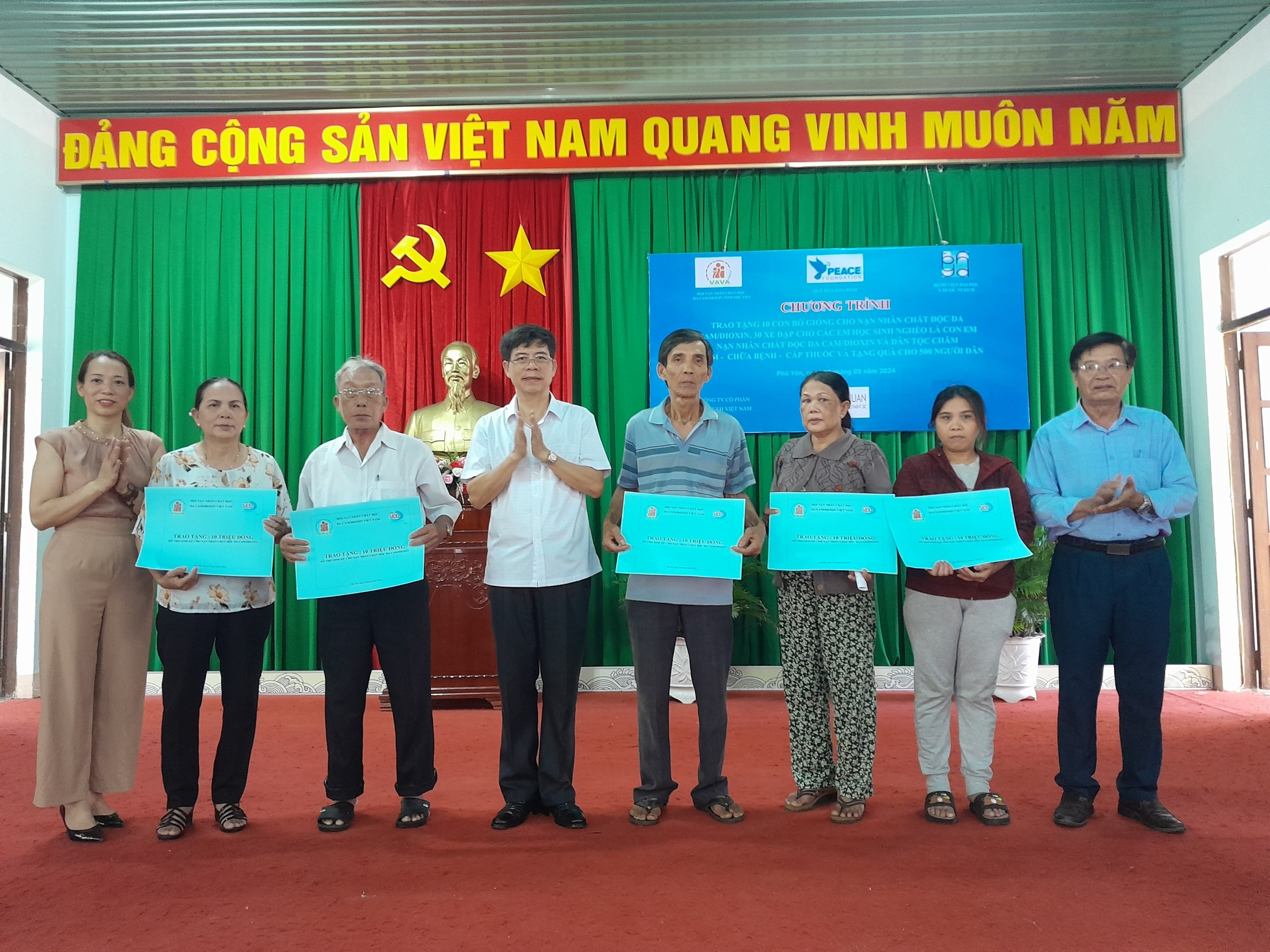 Trung ương Hội Nạn nhân chất độc da cam/dioxin Việt Nam hỗ trợ sinh kế cho 5 gia đình nạn nhân, mỗi gia đình 10 triệu đồng. Quỹ Hoa Hòa Bình tặng 30 xe đạp, mỗi chiếc trị giá 2 triệu đồng, cho học sinh nghèo hiếu học của các huyện: Đồng Xuân, Sơn Hòa và Sông Hinh; tặng 10 con bò giống, mỗi con trị giá 12 triệu đồng, cho 10 gia đình nạn nhân chất độc da cam trên địa bàn tỉnh. Đoàn y bác sĩ của Bệnh viện Đại học Y dược Thành phố Hồ Chí Minh có 26 người đã tổ chức khám bệnh, cấp thuốc miễn phí và trao quà cho 500 nạn nhân chất độc da cam và người khuyết tật, với số tiền trị giá 363 triệu đồng. Tổng số tiền hỗ trợ đợt này là 593 triệu đồng./.