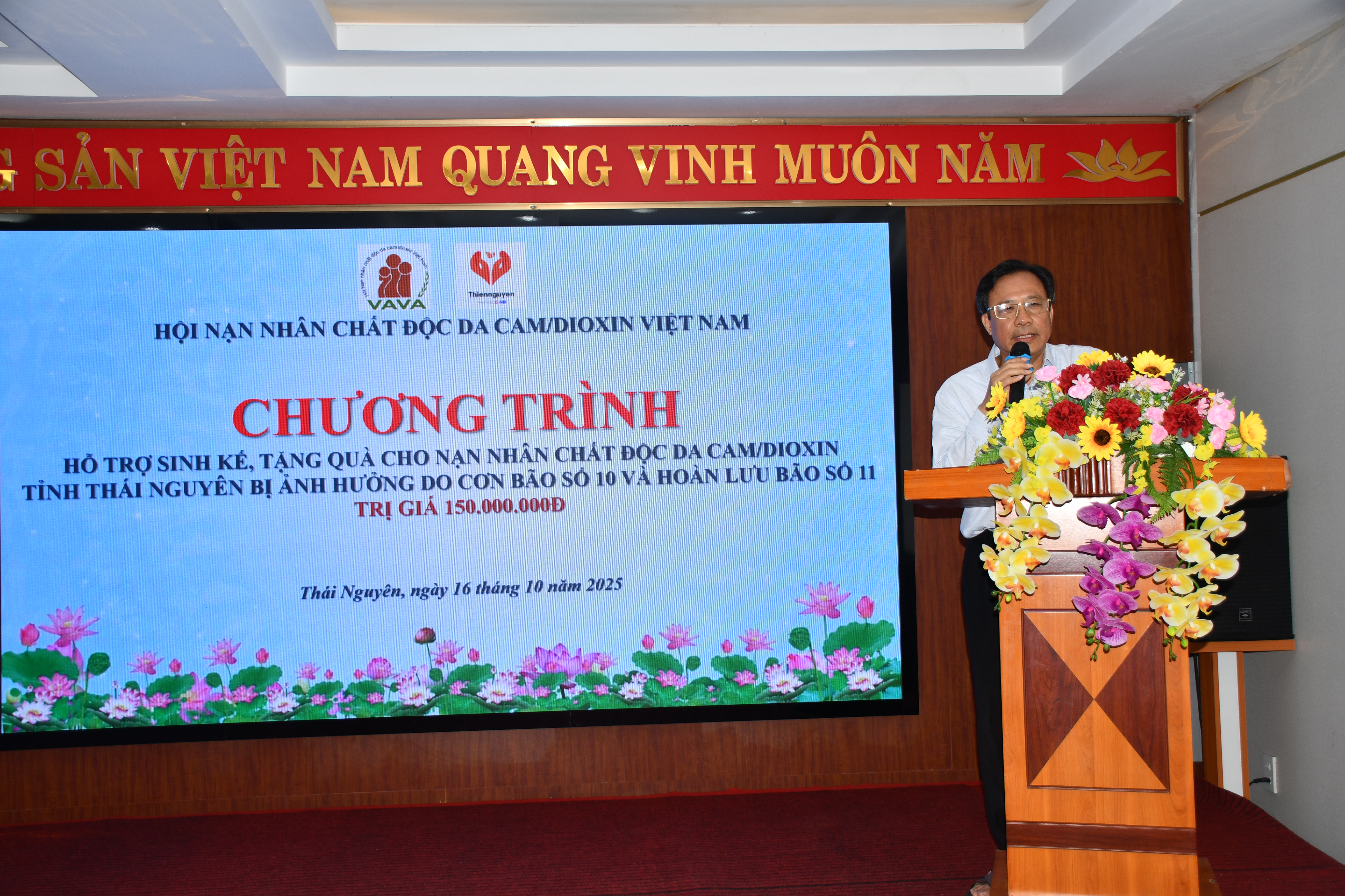 Thực hiện Kế hoach số 210/KH-TWH, ngày 10/10/2025, để kịp thời hỗ trợ giúp đỡ nạn nhân chất độc da cam khắc phục những thiệt hại do bão số 10 và hoàn lưu bão số 11 gây ra, trong hai ngày 16 và 17/10/2025, Đoàn công tác của Trung ương Hội NNCĐĐC/dioxin Việt Nam do Tiến sĩ Phạm Xuân Hưng, Phó Chủ tịch – Giám đốc Quỹ NNCĐĐCdioxin Việt Nam làm Trưởng đoàn, cùng đi có bà Nguyễn Thị Phương, Ban Tài chính đã thăm, tặng quà, hỗ trợ NNCĐĐC tại 2 tỉnh Thái Nguyên và Cao bằng bị thiệt hại do bão số 10 và hoàn lưu bão số 11 gây ra .