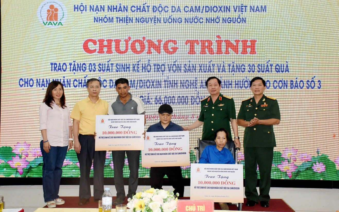 Thay mặt Trung ương Hội, Trung tướng Nguyễn Hữu Chính; bà Lê Thúy Hà – đại diện Nhóm thiện nguyện Uống nước nhớ nguồn; và bà Lê Hồng Nga – đại diện Nhóm thiện nguyện Nga+ đã trao 3 suất sinh kế hỗ trợ vốn sản xuất cùng 30 suất quà cho các gia đình nạn nhân chất độc da cam bị ảnh hưởng bởi bão số 3, với tổng trị giá 66 triệu đồng.