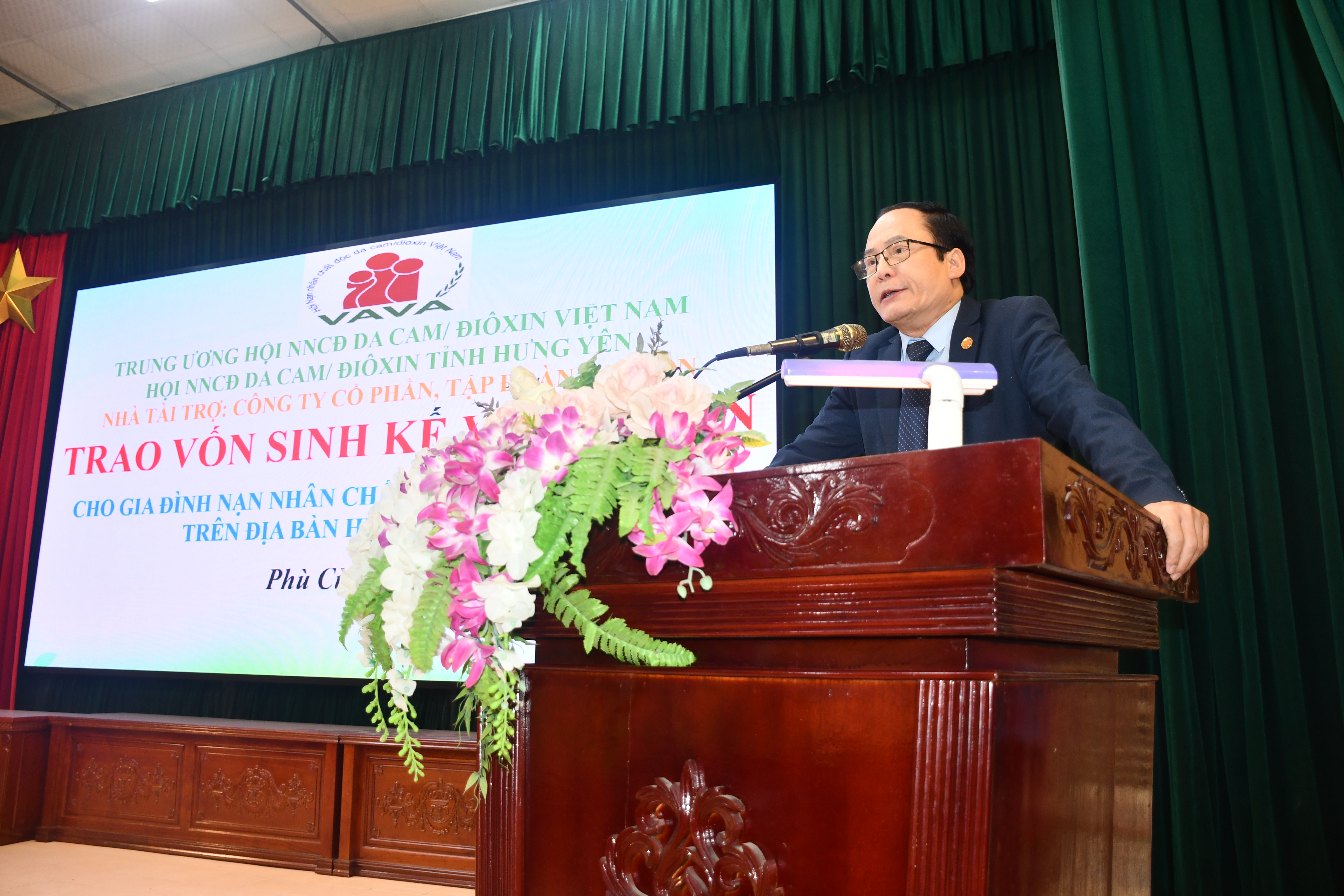 Ông Trần Xuân Vui, Phó bí thư Thường trực Huyện ủy Phù Cừ và ông Bùi Tuấn Anh, Phó chủ tịch UBND thành phố Hưng Yên đã phát biểu cảm ơn sự quan tâm của Trung ương Hội NNCĐDC/dioxin Việt Nam và Công ty Cổ phần Tập đoàn HDMON đã hỗ trợ vốn sinh kế cho các gia đình NNCĐDC, đây là tấm lòng nhân ái đối với nạn nhân và gia đình của họ, mong các gia đình được hỗ trợ vốn sử dụng đúng mục đích đạt hiệu quả cao, Hội NNCĐDC/dioxin cần sâu sát nắm chắc từng hoàn cảnh để có đề xuất với cấp ủy chính quyền địa phương hỗ trợ giúp đỡ phù hợp thiết thực nhất.