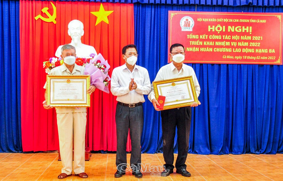 Tại Hội nghị tổng kết công tác năm 2021 và triển khai phương hướng, nhiệm vụ năm 2022 của Hội NNCĐDC/dioxin, ông Dương Huỳnh Khải, Phó chủ tịch HĐND tỉnh Cà Mau, thừa uỷ quyền Chủ tịch nước, trao Huân chương Lao động hạng Ba cho Hội và cá nhân ông Nguyễn Xuân Hùng (bìa trái, Chủ tịch Hội) về những thành tích xuất sắc trong phong trào hành động vì NNCĐDC/dioxin giai đoạn 2016 -2021.