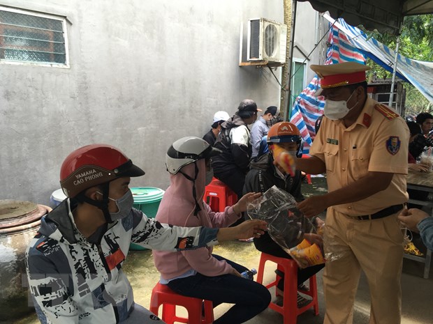 Cảnh sát giao thông Công an tỉnh Bến Tre hỗ trợ thức ăn, nước uống cho người dân làm thủ tục tại chốt cầu Rạch Miễu.