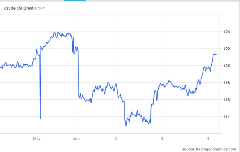 Giá dầu đã tăng vọt trở lại như những ngày đầu của cuộc chiến ở Ukraine. Hồi đầu tuần trước, giá dầu Brent tiêu chuẩn toàn cầu tăng vọt lên 124 USD/thùng. Tính đến ngày 5/6, theo dữ liệu của Trading Economics, dầu Brent được giao dịch quanh ngưỡng 121 USD/thùng.