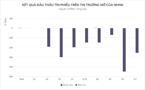 Cụ thể, trong phiên cuối tuần 1/7 vừa qua, cơ quan quản lý tiền tệ tiếp tục hoạt động tích cực trên thị trường mở, trong đó, NHNN đã thực hiện rút gần 25.600 tỷ đồng khỏi hệ thống ngân hàng thông qua bán đấu thầu tín phiếu.