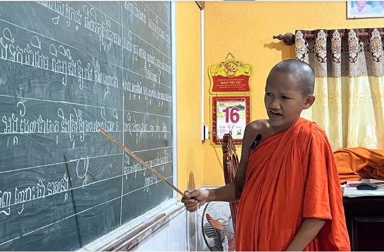 “Tôi dạy chữ Khmer cho các em được 4 năm rồi. Lớp học này được mở ra từ ý tưởng của sư cả. Sư cả muốn các em biết chữ Việt và chữ Khmer. Dù tôi có thân hình nhỏ nhắn nhưng các em vẫn rất tôn trọng”, sư Chau Sóc Thon nói.