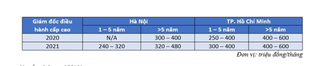 Cùng một vị trí nhưng số năm kinh nghiệm và địa điểm làm việc có thể mang lại mức lương khác nhau cho nhân sự. Ở Hà Nội, năm 2020, các công ty không tuyển nhân sự với kinh nghiệm chỉ từ 1 - 5 năm. Tuy nhiên, năm 2021, vị trí này có thể nhận mức lương lên tới 320 triệu đồng/tháng. Còn với kinh nghiệm từ 5 năm trở lên, nhân sự có thể kiếm được từ 320 - 480 triệu đồng/tháng vào năm 2021, cao hơn từ 20 - 80 triệu đồng so với năm 2020.