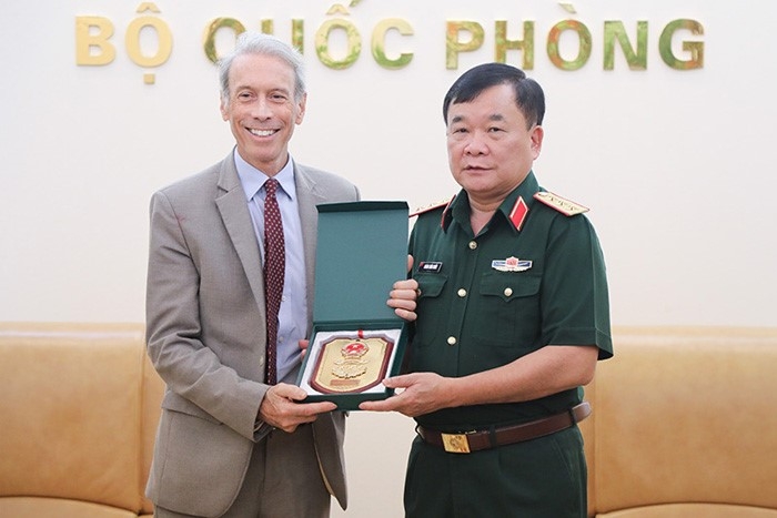 | Thượng tướng Hoàng Xuân Chiến trao quà lưu niệm tặng Ngài Tim Rieser. |