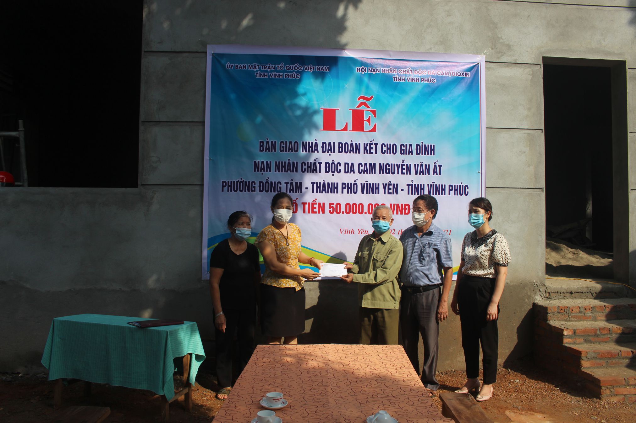 Với tinh thần “ Thương người như thể thương thân”, “ Lá lành đùm lá rách”, Nhân dịp kỷ niệm 60 năm Thảm họa da cam ở Việt Nam (10/8/1961 -10/8/2021), Hội Nạn nhân chất độc da cam/dioxin tỉnh Vĩnh Phúc phối, kết hợp với một số sở, ban ngành đoàn thể và chính quyền địa phương đến thăm, hỗ trợ 50 triệu đồng làm nhà cho gia đình nạn nhân chất độc da cam có hoàn cảnh đặc biệt khó khăn đó là: ông Nguyễn Văn Ất, phường Đồng Tâm, thành phố Vĩnh Yên, kinh phí hỗ trợ được trích một phần kinh phí từ nguồn hỗ trợ của Công ty Cổ phần Ô tô Trường Hải – THACO do Ủy ban Mặt trận Tổ quốc Việt Nam tỉnh Vĩnh Phúc vận động, sự hỗ trợ đã giúp gia đình có thêm động lực để cố gắng vươn lên trong cuộc sống hòa nhập với cộng đồng.