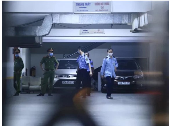 Lực lượng chức năng khám xét tại trụ sở Công ty Cổ phần Chứng khoán Trí Việt ở Hà Nội - Ảnh: Hữu Hưng