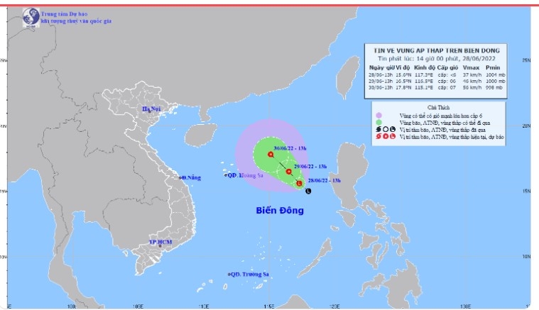Đến 13h ngày 29/6, áp thấp nhiệt đới cách quần đảo Hoàng Sa khoảng 550 km về phía Đông. Sức gió mạnh nhất vùng gần tâm áp thấp nhiệt đới mạnh cấp 6 (40 - 50 km/giờ), giật cấp 8.
