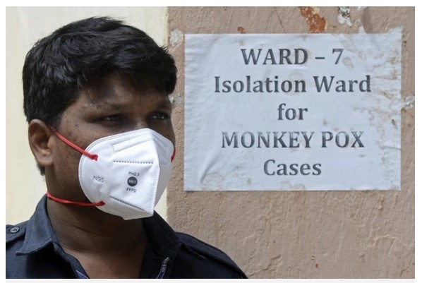 | Nhân viên bảo vệ đứng ở lối vào của khu cách ly dành cho bệnh nhân đậu mùa khỉ tại một bệnh viện ở TP Hyderabad (Ấn Độ) vào ngày 25-7-2022 - Ảnh: AFP |