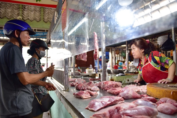 | Bà Dương Mai (tiểu thương chợ Bà Chiểu, quận Bình Thạnh, TP.HCM) cho biết giá thịt heo những ngày qua giảm 4.000 đồng/ kg các loại - Ảnh: N.PHƯỢNG |