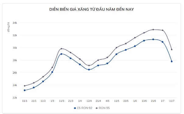 Từ 0h ngày 11/7, sau khi áp dụng giảm thêm thuế bảo vệ môi trường, giá xăng E5 RON 92 trong nước giảm 3.110 đồng/lít còn 27.780 đồng/lít và xăng RON 95 giảm 3.090 đồng/lít còn 29.670 đồng/lít.
