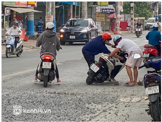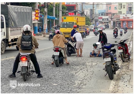 Nhiều xe máy đã bị ngã trên đường do bị trượt đất đá dăm rơi vãi trên đường