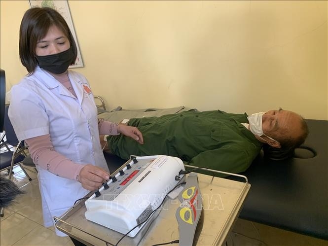 | Nhân viên điều dưỡng sử dụng máy điện xung, phục hồi sức khỏe cho nạn nhân da cam tại Trung tâm Bảo trợ xã hội nạn nhân chất độc da cam/Dioxin Việt Nam (thuộc Trung ương Hội Nạn nhân chất độc da cam/dioxin Việt Nam). |