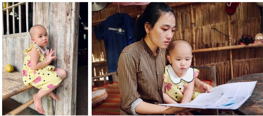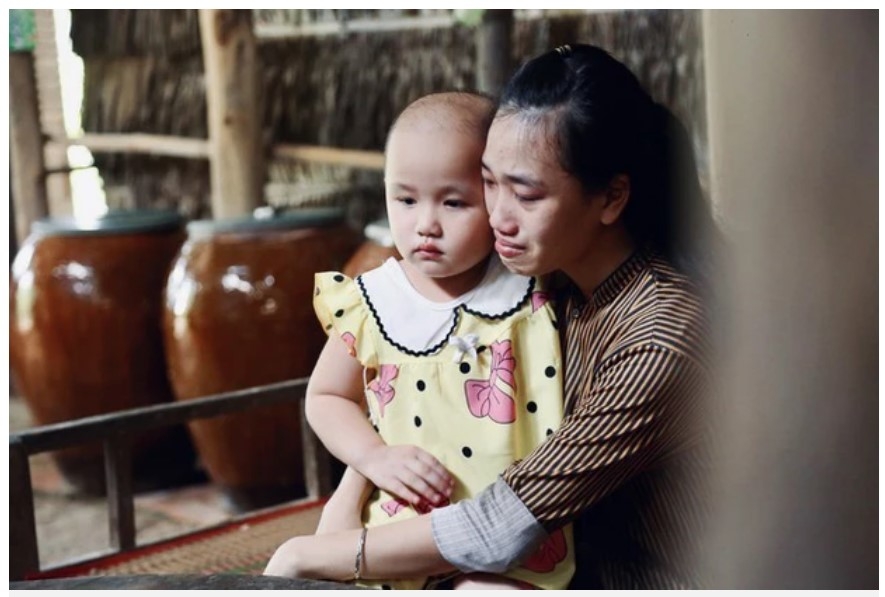 Mái tóc dài của con cũng đã không còn, thay vào đó là cái đầu trọc như những đứa trẻ kém may mắn mắc bệnh ung thư khác. Ôm lấy đứa con gái nhỏ vào lòng, anh Vũ nghẹn lời.