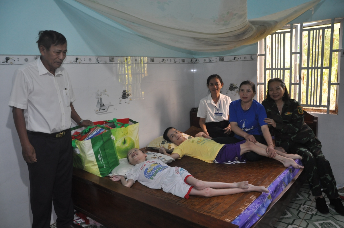 Gia đình ông Nguyễn Ngọc Niệm ở thôn Tân Hiệp 2, xã Bù Nho có 2 người con đều do ảnh hưởng chất độc da cam từ ông bà ngoại từng tham gia chiến trường Quảng Trị. Nhìn cháu Nguyễn Ngọc Tuấn, sinh năm 2000 và cháu Nguyễn Ngọc Lương, sinh năm 2012 nằm trên giường, tay chân lẳng khẳng, đầu, mặt, thân thể ốm còm, ngơ ngác, miệng 2 cháu cười ngượng ngịu, chúng tôi không khỏi chạnh lòng, thương cảm. Bà Nguyễn Thị Thuận, Phó chủ tịch Thường trực Hội NNCĐDC/dioxin tỉnh Bình Phước không cầm được nước mắt sờ nắn tay chân cháu Tuấn. Ngồi cạnh là bà Lê Thị Hà, Phó chủ tịch UBND xã Bù Nho cũng xúc động quá thương 2 cháu. Tiếp đó, chúng tôi theo đoàn đến trao tặng quà cho ông Nguyễn Văn Tập ở thôn Tân Lực, xã Bù Nho. Ông Tập sinh năm 1940, thương binh hạng ¾ từng tham gia chiến trường Đông Nam bộ. Gia đình ông có người con gái sinh năm 1976, hiện chỉ có nằm một chỗ và trạng thái không được tỉnh táo bình thường...