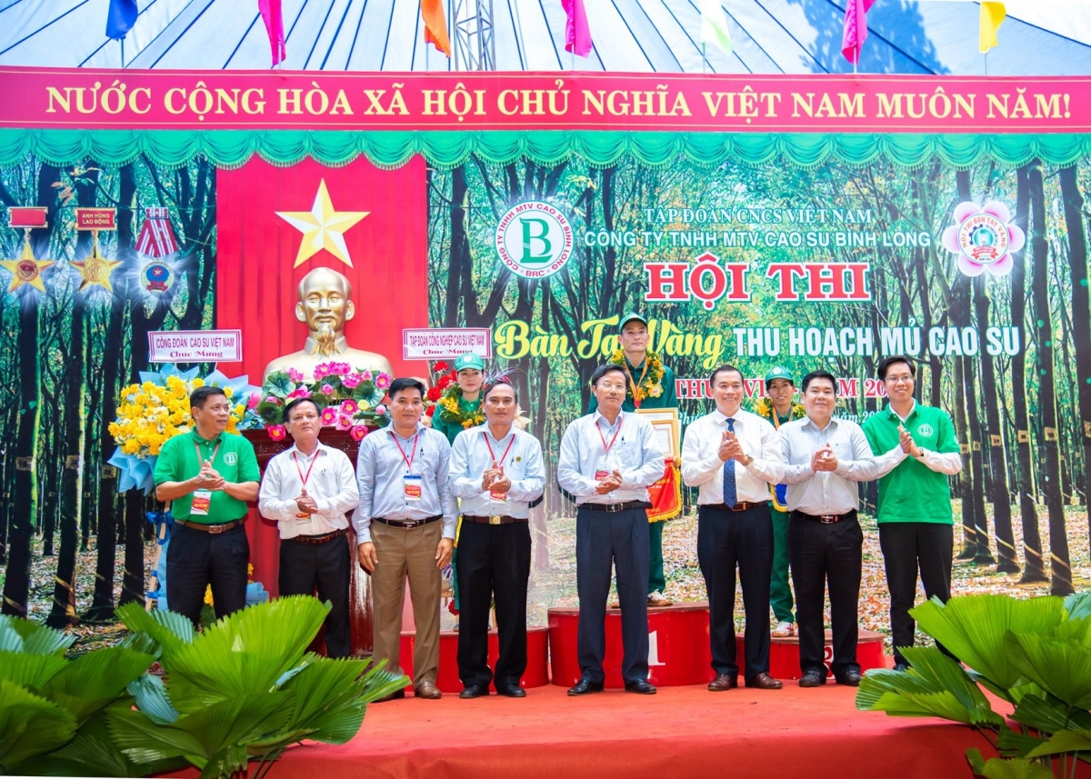 | Lãnh đạo Tập đoàn, công ty trao thưởng cho các cá nhân tại Hội thi Bàn tay vàng thu hoạch mủ cao su năm 2022 |