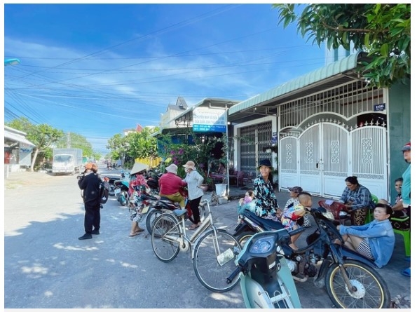 | Hàng xóm đến trước nhà ông Tám thăm hỏi và động viên gia đình |
