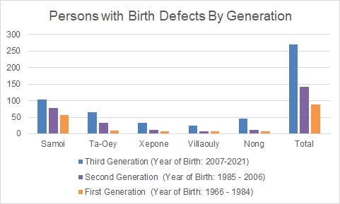 Người Việt Nam nhận thấy rằng 1,4% dân số ở A Lưới sinh ra bị dị tật bẩm sinh được cho là có liên quan đến chất diệt cỏ nhiễm Dioxin. Ngược lại, ở phía biên giới với Lào ở Samoi, WLP phát hiện ra rằng gần một phần ba hoặc 16 trong số 51 làng, có tỷ lệ người sinh ra bị dị tật bẩm sinh cao hơn. Một lần nữa, khi bạn cũng xem xét các trường hợp động kinh, gần 50 phần trăm số làng có hơn 1,4 phần trăm dân số bị khuyết tật bẩm sinh.