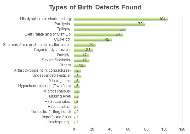 Đa số các làng có ít nhất một người bị dị tật bẩm sinh. Trung bình là bốn trường hợp cho mỗi làng.