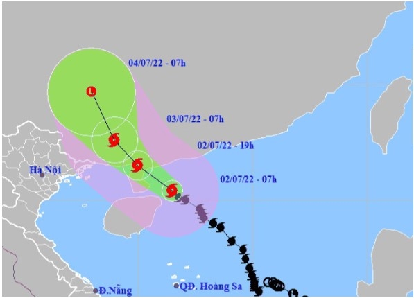 Theo Trung tâm Dự báo khí tượng thủy văn quốc gia, hồi 7 giờ ngày 2/7, vị trí tâm bão số 1 ở vào khoảng 20,4 độ Vĩ Bắc; 111,5 độ Kinh Đông, cách đảo Hải Nam (Trung Quốc) khoảng 90 km về phía Đông Đông Bắc, cách Quảng Ninh khoảng 410 km về phía Đông Đông Nam. Sức gió mạnh nhất vùng gần tâm bão mạnh cấp 11-12 (103-133 km/giờ), giật cấp 15. Bán kính gió mạnh cấp 6, giật cấp 8 khoảng 170 km tính từ tâm bão.