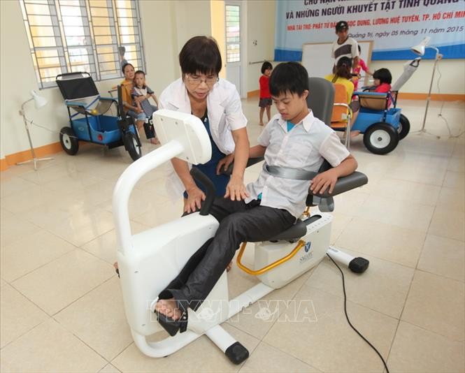 Nhân viên Trung tâm Nuôi dưỡng, phục hồi chức năng và dạy nghề cho nạn nhân chất độc da cam tại thành phố Đông Hà, tỉnh Quảng Trị giúp các trẻ là nạn nhân chất độc da cam/dioxin tập phục hồi chức năng (2015).
