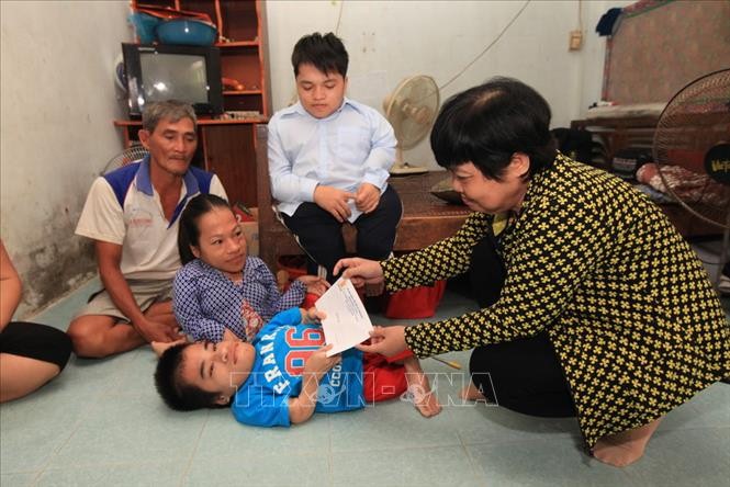 Chủ tịch Hội Nạn nhân chất độc da cam/dioxin tỉnh Kiên Giang Trần Thu Vân tặng quà của Hội cho gia đình anh Phạm Văn Bưởi và chị Nguyễn Thị Viễn, xã Mông Thọ A, huyện Châu Thành, tỉnh Kiên Giang, có 3 con bị nhiễm chất độc da cam/dioxin.