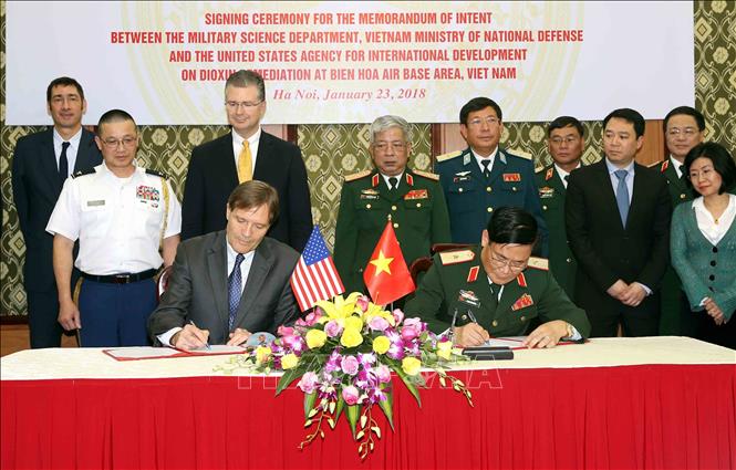 Lễ ký bản ghi nhận ý định giữa Cục khoa học quân sự, Bộ Quốc phòng Việt Nam với Cơ quan Phát triển Quốc tế Hoa Kỳ (USAID) về xử lý ô nhiễm dioxin ở khu vực sân bay Biên Hòa, Việt Nam (23/1/2018).