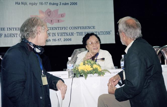 Bà Nguyễn Thị Bình, nguyên Phó Chủ tịch nước, Chủ tịch danh dự Hội Nạn nhân chất độc da cam/dioxin Việt Nam, Chủ tịch Quỹ Hòa bình và Phát triển Việt Nam trao đổi với các đại biểu quốc tế tại Hội nghị khoa học quốc tế "Nạn nhân chất độc da cam/dioxin - những điều mong muốn" (16-17/3/2006).